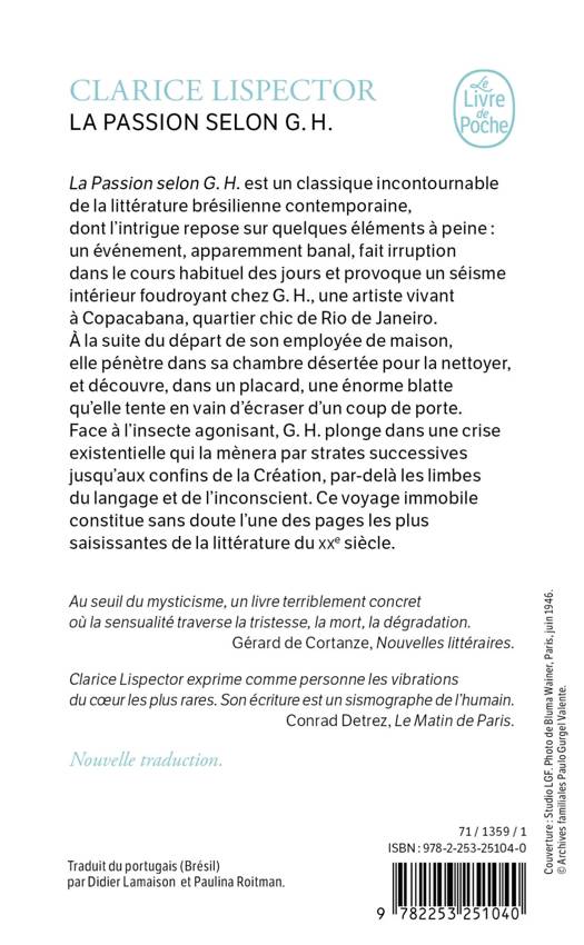 La Passion selon G. H. est un classique incontournable de la litte rature bre silienne contemporaine, dont l’intrigue repose sur quelques e le ments a peine : un e ve nement, apparemment banal, fait irruption dans le cours habituel des jours et provoque un se isme inte rieur foudroyant chez G. H., une artiste vivant a Copacabana, quartier chic de la ville de Rio de Janeiro. Elle pe ne tre, pour la nettoyer, dans la chambre de l’employe e de maison a la suite de son de part, et de couvre, dans un placard, une e norme blatte qu’en vain elle tente d’e craser d’un coup de porte. Face a l’insecte agonisant, G. H. plonge dans une crise existentielle qui la me nera par strates successives jusqu’aux confins de la Cre ation, par-dela les limbes du langage et de l’inconscient. Ce voyage immobile constitue sans doute l’une des pages les plus saisissantes de la litte rature du XXe sie cle.