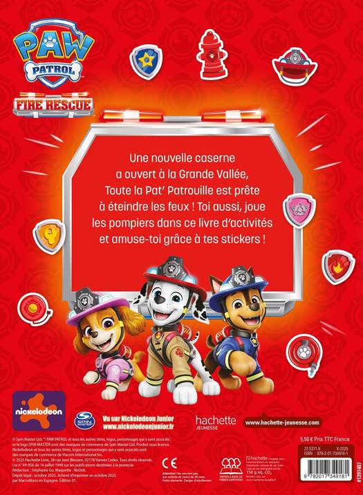 Une nouvelle caserne a ouvert à la Grande Vallée, Toute la Pat’ Patrouille est prête à éteindre les feux ! Toi aussi, joue les pompiers dans ce livre d’activités et amuse-toi grâce à tes stickers !