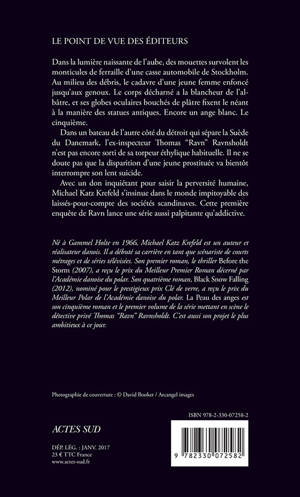 Dans la lumière naissante de l'aube, des mouettes survolent les monticules de ferraille d'une casse automobile de Stockholm. Au milieu des débris, le cadavre d'une jeune femme enfoncé jusqu'aux genoux. Le corps décharné a la blancheur de l'albâtre, et ses globes oculaires bouchés de plâtre fixent le néant à la manière des statues antiques. Encore un ange blanc. Le cinquième. Dans un bateau de l'autre côté du détroit qui sépare la Suède du Danemark, l'ex-inspecteur Thomas "Ravn" Ravnsholdt n'est pas encore sorti de sa torpeur éthylique habituelle. Il ne se doute pas que la disparition d'une jeune prostituée va bientôt interrompre son lent suicide. Avec un don inquiétant pour saisir la perversité humaine, Michael Katz Krefeld s'insinue dans le monde impitoyable des laissés-pour-compte des sociétés scandinaves. Cette première enquête de Ravn lance une série aussi palpitante qu'addictive.