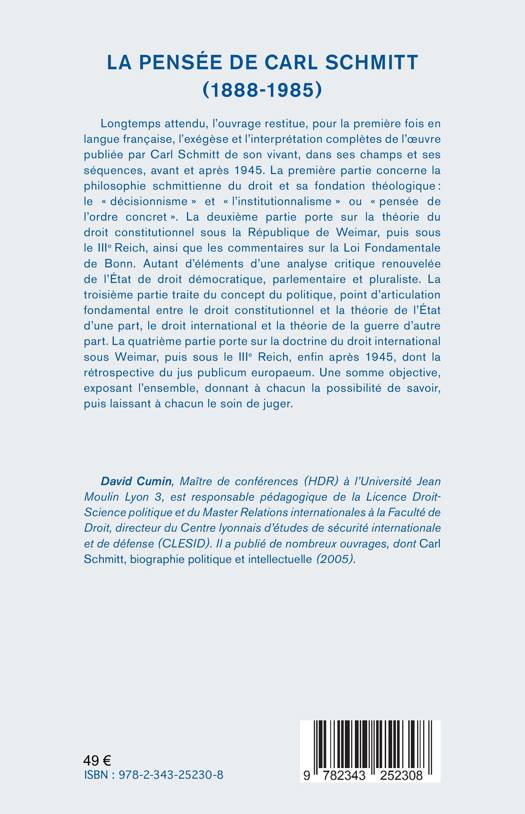 Cet ouvrage restitue, pour la première fois en langue française, l'exégèse et l'interprétation complètes de l'oeuvre publiée par Carl Schmitt de son vivant, dans ses champs et ses séquences, avant et après 1945. La première partie concerne la philosophie schmittienne du droit et sa fondation théologique : le « décisionnisme » et « l'institutionnalisme » ou « pensée de l'ordre concret ». La deuxième partie porte sur la théorie du droit constitutionnel sous la République de Weimar, puis sous le IIIe Reich, ainsi que les commentaires sur la Loi Fondamentale de Bonn. Autant d'éléments d'une analyse critique renouvelée de l'État de droit démocratique, parlementaire et pluraliste. La troisième partie traite du concept du politique, point d'articulation fondamental entre le droit constitutionnel et la théorie de l'État d'une part, le droit international et la théorie de la guerre d'autre part. La quatrième partie porte sur la doctrine du droit international sous Weimar, puis sous le IIIe Reich, enfin après 1945, dont la rétrospective du jus publicum europaeum.
