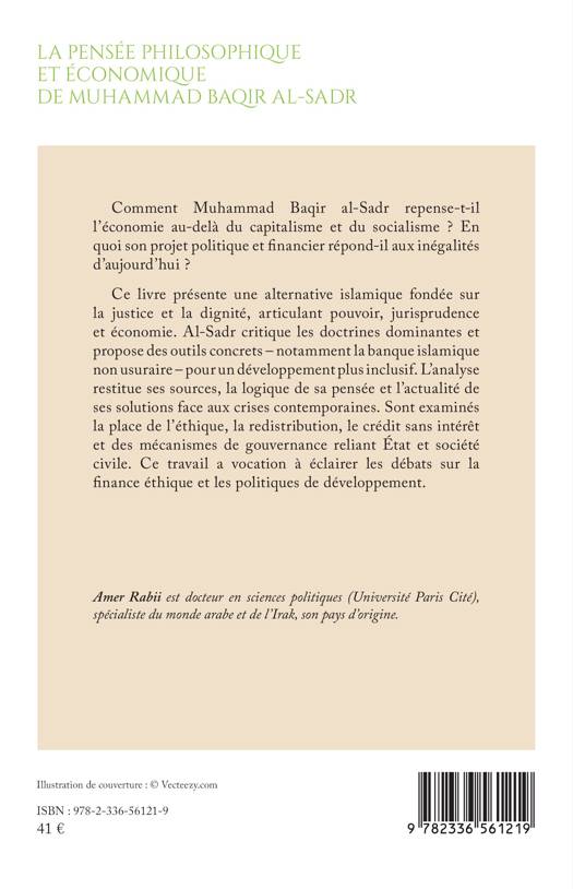 Comment Muhammad Baqir al-Sadr repense-t-il l'économie au-delà du capitalisme et du socialisme ? En quoi son projet politique et financier répond-il aux inégalités d'aujourd'hui ? Ce livre présente une alternative islamique fondée sur la justice et la dignité, articulant pouvoir, jurisprudence et économie. Al-Sadr critique les doctrines dominantes et propose des outils concrets - notamment la banque islamique non usuraire - pour un développement plus inclusif. L'analyse restitue ses sources, la logique de sa pensée et l'actualité de ses solutions face aux crises contemporaines. Sont examinés la place de l'éthique, la redistribution, le crédit sans intérêt et des mécanismes de gouvernance reliant État et société civile. Ce travail a vocation à éclairer les débats sur la finance éthique et les politiques de développement.