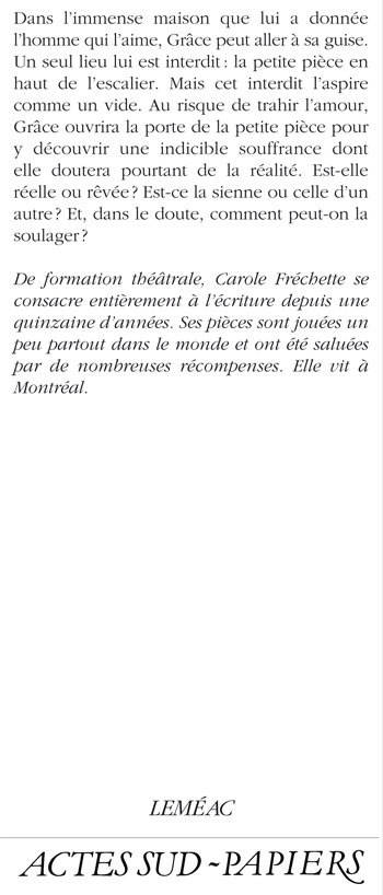 «De formation théâtrale, Carole Fréchette se consacre entièrement à l'écriture depuis une quinzaine d'années. Ses pièces sont jouées un peu partout dans le monde et ont été saluées par de nombreuses récompenses. Elle vit à Montréal.»