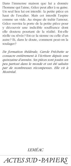 Dans l'immense maison que lui a donnée l'homme qui l'aime, Grâce peut aller à sa guise. Un seul lieu lui est interdit : la petite pièce en haut de l?escalier. Mais cet interdit l'aspire comme un vide. Au risque de trahir l'amour, Grâce ouvrira la porte de la petite pièce pour y découvrir une indicible souffrance dont elle doutera pourtant de la réalité. Est-elle réelle ou rêvée ? Est-ce la sienne ou celle d?un autre ? Et, dans le doute, comment peut-on la soulager ?