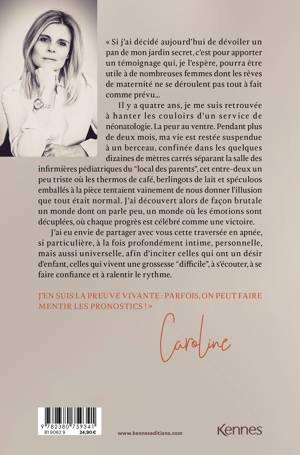 « Si j’ai décidé aujourd’hui de dévoiler un pan de mon jardin secret, c’est pour apporter un témoignage qui, je l’espère, pourra être utile à de nombreuses femmes dont les rêves de maternité ne se déroulent pas toutà fait comme prévu… Il y a quatre ans, je me suis retrouvée à hanter les couloirs d’un service de néonatologie. La peur au ventre. Pendant plus de deux mois, ma vie est restée suspendue à un berceau, confinée dans les quelques dizaines de mètres carrés séparant la salle des infirmières pédiatriques du “local des parents”, cet entre-deux un peu triste où les thermos de café, berlingots de lait et spéculoos emballés à la pièce tentaient vainement de nous donner l’illusion que tout était normal. J’ai découvert alors de façon brutale un monde dont on parle peu, un monde où les émotions sont décuplées, où chaque progrès est célébré comme une victoire. J’ai eu envie de partager avec vous cette traversée en apnée, si particulière, à la fois profondément intime, personnelle, mais aussi universelle, afin d’inciter celles qui ont un désir d’enfant, celles qui vivent une grossesse “difficile”, à s’écouter, à se faire confiance et à ralentir le rythme.