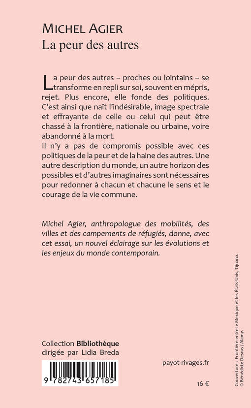 La peur des autres - proches ou lointains - se transforme en repli sur soi, souvent en mépris, rejet. Plus encore, elle fonde des politiques. C'est ainsi que naît l'indésirable, image spectrale et effrayante de celle ou celui qui peut être chassé à la frontière, nationale ou urbaine, voire abandonné à la mort. Il n'y a pas de compromis possible avec ces politiques de la peur et de la haine des autres. Une autre description du monde, un autre horizon des possibles et d'autres imaginaires sont nécessaires pour redonner à chacun et chacune le sens et le courage de la vie commune.