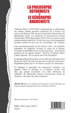 Clémence Royer (1830-1902), anthropologue et philosophe, est connue comme première traductrice de L'Origine des espèces de Darwin. Elle est aussi la première théoricienne du darwinisme social. Les féministes en font l'une des leurs. Pierre Kropotkine (1842-1921) est un penseur anarchiste. Il était aussi un géographe reconnu par ses pairs. Leur conversation porte sur les inégalités, la femme, la morale, ils abordent Darwin, Marx ou Spencer. Si leur dialogue reflète les idéologies du XIXe siècle, il reste actuel quand il s'agit de solidarité et de démocratie directe.