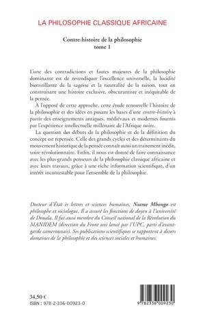 Cette étude renouvelle l'histoire de la philosophie et des idées en posant les bases d'une contre-histoire à partir des enseignements antiques, médiévaux et modernes fournis par l'expérience intellectuelle millénaire de l'Afrique noire. La question des débuts de la philosophie et de la définition du concept est repensée. Enfin, il nous est donné de faire connaissance avec les plus grands penseurs de la philosophie classique africaine et avec leurs travaux.