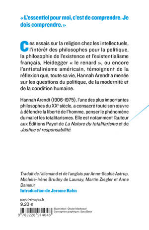 Ces essais sur la religion chez les intellectuels, l'intérêt des philosophes pour la politique, la philosophie de l'existence et l'existentialisme français, Heidegger "le renard", ou encore l'antistalinisme américain témoignent de la réflexion que, toute sa vie, Hannah Arendt a mené sur les questions du politique, de la modernité et de la condition humaine.
