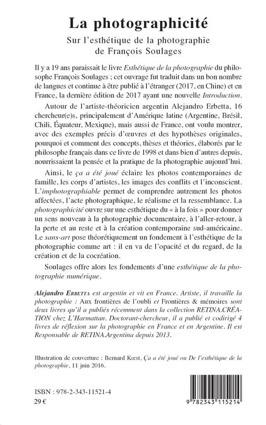 Autour de l'artiste-théoricien argentin Alejandro Erbetta, 16 chercheurs, principalement d'Amérique Latine mais aussi de France, ont voulu montrer avec des exemples précis d'oeuvres et des hypothèses orginales, pourquoi et comment des concepts, thèses et théories, élaborés par François Soulages dans son livre Esthétique de la photographie (paru en 1998) et dans bien d'autres depuis, nourissaient la pensée et la pratique de la photographie aujourd'hui.