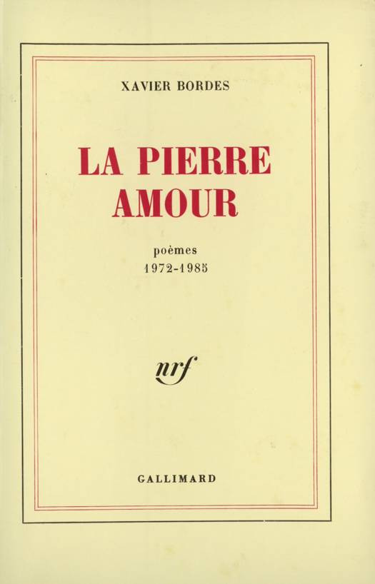 La Pierre Amour, poème écrit entre 1972 et 1985, est une oeuvre-monde. Aujourd'hui, comme à l'heure de la composition de ce livre, nous évoluons dans un monde complexe. À la complexité de ce monde mondialisé, la responsabilité du poète écrivant dans sa langue maternelle est de répondre par une oeuvre prenant en compte cette complexité en proposant, pour la supporter, pour la sublimer, une profondeur conciliant les forces en présence, forces contradictoires, voire même adversaires. Le poème peut cela. Le poète, lorsqu'il est homme de la plus haute mémoire, le sait. Ainsi agit La Pierre Amour de Xavier Bordes, dont le titre même suggère qu'un ouvrage ayant dimension de cosmos lyrique peut répondre et subjuguer le chaos général. En ce sens, La Pierre Amour pourrait bien être celle qui servit à sculpter la fontaine de jouvence, celle sur laquelle est gravée la formule d'éternité et devant laquelle se recueille le Coeur pour la déchiffrer. Un tel livre, par son amplitude, son architecture, la richesse de ses questionnements, de ses explorations et de ses intuitions, apparaît comme fort singulier, en quelque sorte unique, dans le paysage poétique contemporain.