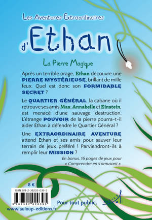 Après un terrible orage, Ethan découvre une pierre mystérieuse, brillant de mille feux. Quel est donc son formidable secret ? Le Quartier Général, la cabane où il retrouve ses amis Max, Annabelle et Einstein, est menacé d'une sauvage destruction. L'étrange pouvoir de la pierre pourra-t-il aider Ethan à défendre le Quartier Général ?Une extraordinaire aventure attend Ethan et ses amis pour sauver leur terrain de jeux préféré ! Parviendront-ils à remplir leur mission ?En bonus, 16 pages de jeux pour « Comprendre en s'amusant ».