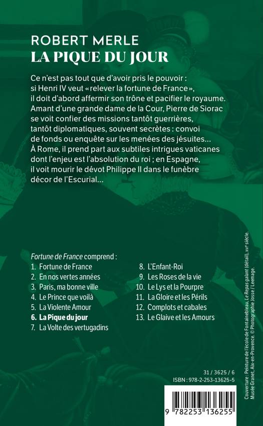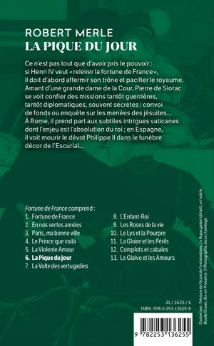 Ce n'est pas tout que d'avoir pris le pouvoir: si Henri IV veut « relever la fortune de France », il doit d'abord affermir son trône et pacifier le royaume. Amant d'une grande dame de la Cour, Pierre de Siorac se voit confier des missions tantôt guerrières, tantôt diplomatiques, souvent secrètes: convoi de fonds ou enquète sur les menées des jésuites... À Rome, il prend part aux subtiles intrigues vaticanes dont l'enjeu est l'absolution du roi; en Espagne, il voit mourir le dévot Philippe II dans le funèbre décor de l'Escurial...