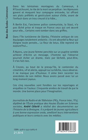 Dans les lointaines montagnes du Cameroun, à N’Goutchoumi, le rite de la mort se perpétue. À Berlin Est, l’ancienne police communiste, la Stasi, n’a pas lâché prise et traque en France ceux qui ont œuvré pour elle... Certains vont tomber dans ses griffes. Dans l’île tunisienne de Djerba, l’histoire antique de ces équipages totalement anéantis : ils ont absorbé la fleur qui éloigne toute pensée... La fleur de lotus. Elle reprend vie aujourd’hui...À Nyons, une jeune femme penchée sur un pupitre semble achever d’écrire un message. L’homme qui l’observe pourrait éviter un drame, mais par lâcheté, peut-être, il n’en fait rien. À Crozon, au bout de la presqu’île, le cantonnier du cimetière, vif et alerte, appuyé sur sa bêche, nous observe. Il ne manque pas d’humour. Il aime bien raconter les anecdotes de son métier. Nous avons passé avec lui un long moment joyeux. Ces cinq nouvelles sont fondées sur les reportages et enquêtes ce l’auteur. Cinquante années de travail de par le monde. Une bonne place pour l’imagination.