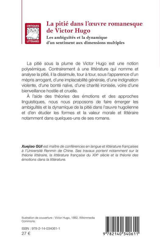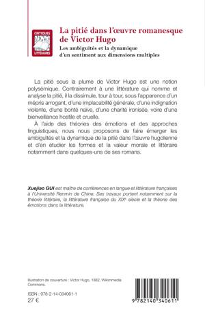 La pitié sous la plume de Victor Hugo est une notion polysémique. Contrairement à une littérature qui nomme et analyse la pitié, il la dissimule, tour à tour, sous l'apparence d'un mépris arrogant, d'une implacabilité générale, d'une indignation violente, d'une bonté naïve, d'une charité ironisée, voire d'une bienveillance hostile et cruelle. À l'aide des théories des émotions et des approches linguistiques, nous nous proposons de faire émerger les ambiguïtés et la dynamique de la pitié dans l'oeuvre hugolienne et d'en étudier les formes et la valeur morale et littéraire notamment dans quelques-uns de ses romans.