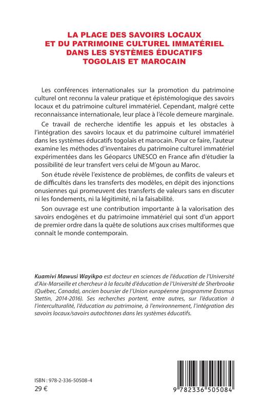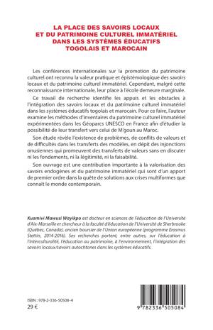 Les conférences internationales sur la promotion du patrimoine culturel ont reconnu la valeur pratique et épistémologique des savoirs locaux et du patrimoine culturel immatériel. Cependant, malgré cette reconnaissance internationale, leur place à l'école demeure marginale. Ce travail de recherche identifie les appuis et les obstacles à l'intégration des savoirs locaux et du patrimoine culturel immatériel dans les systèmes éducatifs togolais et marocain. Pour ce faire, l'auteur examine les méthodes d'inventaires du patrimoine culturel immatériel expérimentées dans les Géoparcs UNESCO en France afin d'étudier la possibilité de leur transfert vers celui de M'goun au Maroc. Son étude révèle l'existence de problèmes, de conflits de valeurs et de difficultés dans les transferts des modèles, en dépit des injonctions onusiennes qui promeuvent des transferts de valeurs sans en discuter ni les fondements, ni la légitimité, ni la faisabilité. Son ouvrage est une contribution importante à la valorisation des savoirs endogènes et du patrimoine immatériel qui sont d'un apport de premier ordre dans la quête de solutions aux crises multiformes que connaît le monde contemporain.