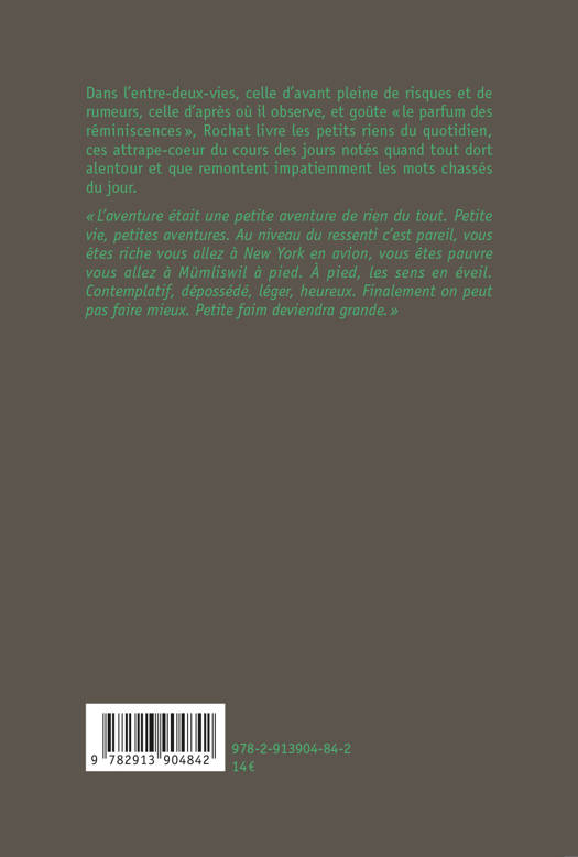 Dans l’entre-deux-vies, celle d’avant pleine de risques et de rumeurs, celle d’après où il observe, et goûte « le parfum des réminiscences », Rochat livre les petits riens du quotidien, ces attrape-coeur du cours des jours notés quand tout dort alentour et que remontent impatiemment les mots chassés du jour.« L’aventure était une petite aventure de rien du tout. Petite vie, petites aventures. Au niveau du ressenti c’est pareil, vous êtes riche vous allez à New York en avion, vous êtes pauvre vous allez à Mümliswil à pied. À pied, les sens en éveil. Contemplatif, dépossédé, léger, heureux. Finalement on peut pas faire mieux. Petite faim deviendra grande. »