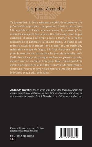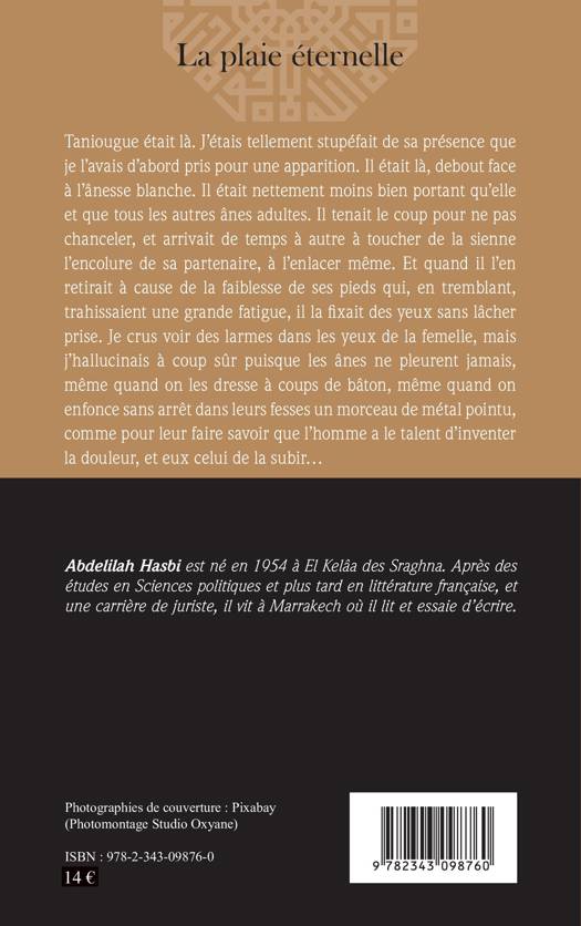 La plaie éternelle n'est pas une métaphore. Elle est réellement vécue par les ânes. Dès leur jeune âge, on les blesse à la croupe et on continue à les piquer à la même place, toute leur vie. Pour les inciter à travailler ! pense-t-on hypocritement. C'est dire toute la cruauté et la cupidité de l'homme, lui le plus paresseux des êtres vivants, ne réalisant pas que les ânes savent aussi vivre en société, être sensibles, sincères et intelligents. Et surtout vivre le vrai amour...Car ce roman est aussi une histoire d'amour entre une ânesse et un âne.