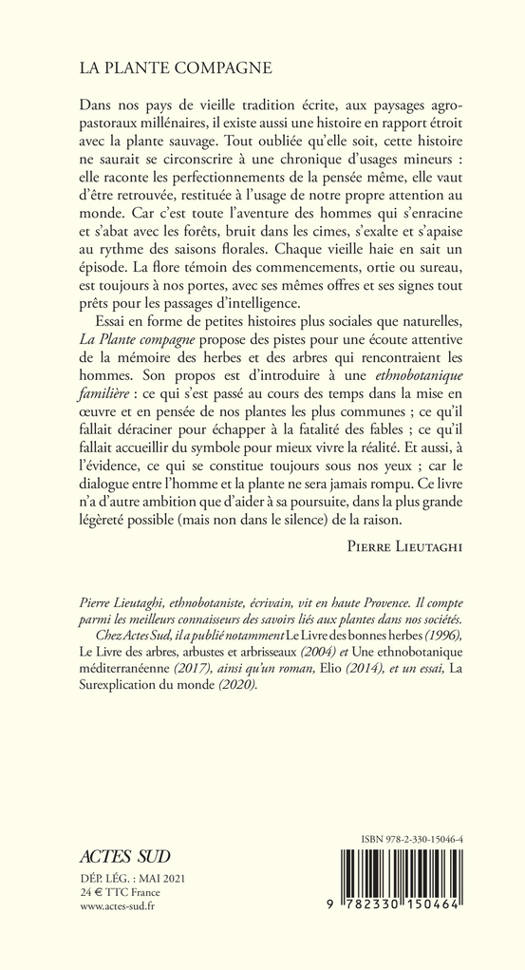 Dans nos pays de vieille tradition écrite, aux paysages agropastoraux millénaires, il existe aussi une histoire en rapport étroit avec la plante sauvage. Tout oubliée qu'elle soit, cette histoire ne saurait se circonscrire à une chronique d'usages mineurs : elle raconte les perfectionnements de la pensée même, elle vaut d'être retrouvée, restituée à l'usage de notre propre attention au monde. Car c'est toute l'aventure des hommes qui s'enracine et s'abat avec les forêts, bruit dans les cimes, s'exalte et s'apaise au rythme des saisons florales. Chaque vieille haie en sait un épisode. La flore témoin des commencements, ortie ou sureau, est toujours à nos portes, avec ses mêmes offres et ses signes tout prêts pour les passages d'intelligence. Essai en forme de petites histoires plus sociales que naturelles, La Plante compagne propose des pistes pour une écoute attentive de la mémoire des herbes et des arbres qui rencontraient les hommes. Son propos est d'introduire à une ethnobotanique familière : ce qui s'est passé au cours des temps dans la mise en oeuvre et en pensée de nos plantes les plus communes ; ce qu'il fallait déraciner pour échapper à la fatalité des fables ; ce qu'il fallait accueillir du symbole pour mieux vivre la réalité. Et aussi, à l'évidence, ce qui se constitue toujours sous nos yeux ; car le dialogue entre l'homme et la plante ne sera jamais rompu. Ce livre n'a d'autre ambition que d'aider à sa poursuite, dans la plus grande légèreté possible (mais non dans le silence) de la raison. Pierre Lieutaghi
