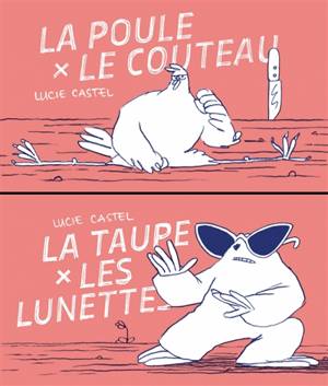 Un flipbook double signé Lucie Castel. La poule et le couteau au recto : Une poule trouve un couteau. Attention les yeux, elle va vous préparer une salade niçoise en moins de temps qu’il faut pour dire “gallinacés”. La taupe et les lunettes au verso : Une taupe a-t-elle vraiment besoin de lunettes surtout quand celle-ci a des yeux laser capables de creuser un tunnel et de ravager votre jardin en un clignement d’œil.