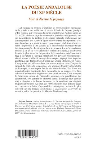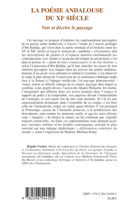 Cet ouvrage se propose d'explorer les représentations paysagères de la poésie arabe médiévale, à travers l'étude de l'oeuvre poétique d'Ibn Hafaga, qui vécut dans la partie orientale d'al-Andalus entre les XIe et XIIe siècles et reçut le surnom de « jardinier » (al-gannan), tant ses descriptions de jardins et d'espaces naturels enchantaient ses contemporains.