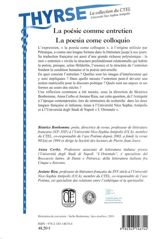 L'expression " la poesia come colloquio " à l'origine utilisée par Pétrarque a connu une longue fortune dans la littérature jusqu'à nos jours. En quoi consiste l'entretien ? Quelles sont les images d'interlocuteur qui y sont impliquées ? Dans quelles mesures l'entretien peut-il devenir une notion matricielle pour le discours poétique ? Quels sont ses enjeux et ses formes aux cours des siècles ?
