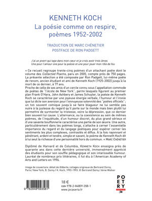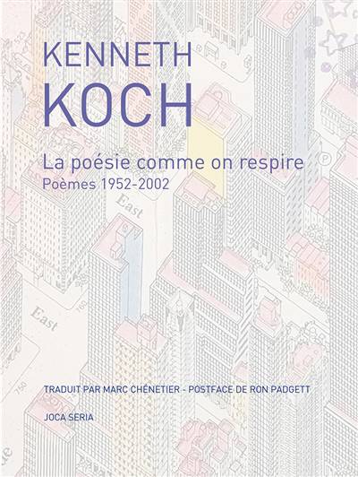 35 poèmes de Kenneth Koch (1925-2002) préfacés par Ron Padgett et traduits par Marc Chénetier. Kenneth Koch fut proche des « poètes de l’École de New York », parmi lesquels figurent au premier plan Frank O’Hara et John Ashbery. La poésie de Kenneth Koch se caractérise par une joyeuse énergie verbale et une thématique que colorent son goût pour les arts de son temps¬– et au premier plan la peinture, mais aussi la musique–, l’humour et l’ironie que lui dicte son aversion pour l’ennuyeuse solennité des « poètes officiels » ; un ton souvent comique jusqu’à se faire blagueur ne lui semble pas nuire à la justesse du regard qu’il porte sur le monde mais bien plutôt lui permettre de surmonter la tristesse, voire la dépression, que ce dernier bien souvent lui cause.