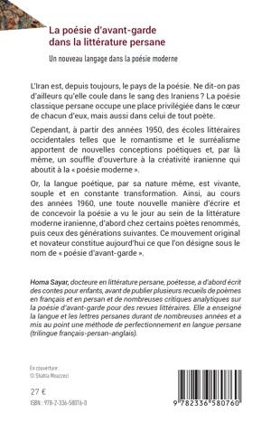 L'Iran est, depuis toujours, le pays de la poésie. Ne dit-on pas d'ailleurs qu'elle coule dans le sang des Iraniens ? La poésie classique persane occupe une place privilégiée dans le coeur de chacun d'eux, mais aussi dans celui de tout poète. Cependant, à partir des années 1950, des écoles littéraires occidentales telles que le romantisme et le surréalisme apportent de nouvelles conceptions poétiques et, par là même, un souffle d'ouverture à la créativité iranienne qui aboutit à la poésie moderne . Or, la langue poétique, par sa nature même, est vivante, souple et en constante transformation. Ainsi, au cours des années 1960, une toute nouvelle manière d'écrire et de concevoir la poésie a vu le jour au sein de la littérature moderne iranienne, d'abord chez certains poètes renommés, puis ceux des générations suivantes. Ce mouvement original et novateur constitue aujourd'hui ce que l'on désigne sous le nom de poésie d'avant-garde .