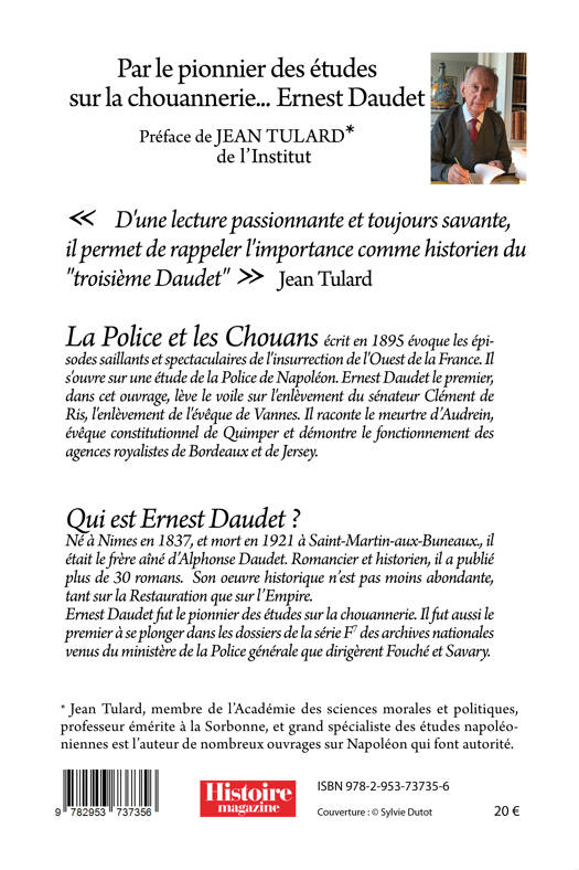 Par le pionnier des études sur la chouannerie... Ernest Daudet « D'une lecture passionnante et toujours savante, il permet de rappeler l'importance comme historien du "troisième Daudet" » Jean Tulard. La Police et les Chouans écrit en 1895 évoque les épisodes saillants et spectaculaires de l'insurrection de l'Ouest de la France. Il s'ouvre sur une étude de la Police de Napoléon. Ernest Daudet le premier, dans cet ouvrage, lève le voile sur l'enlèvement du sénateur Clément de Ris, et de l'évêque de Vannes. Il raconte le meurtre d’Audrein, évêque constitutionnel de Quimper et démontre le fonctionnement des agences royalistes de Bordeaux et de Jersey. Qui est Ernest Daudet ? Né à Nimes en 1837, et mort en 1921 à Saint-Martin-aux-Buneaux., il était le frère aîné d’Alphonse Daudet. Romancier et historien, il a publié plus de 30 romans. Son oeuvre historique n’est pas moins abondante, tant sur la Restauration que sur l’Empire. Ernest Daudet fut le pionnier des études sur la chouannerie. Il fut aussi le premier à se plonger dans les dossiers de la série F7 des archives nationales venus du ministère de la Police générale que dirigèrent Fouché et Savary. Jean Tulard, membre de l’Académie des sciences morales et politiques, professeur émérite à la Sorbonne, et grand spécialiste des études napoléoniennes est l’auteur de nombreux ouvrages sur Napoléon qui font autorité.