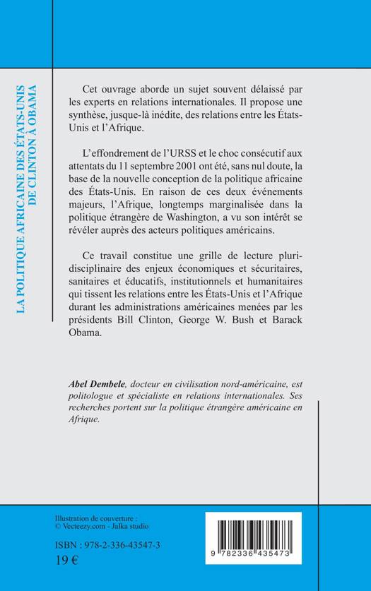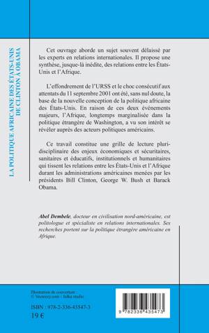 Cet ouvrage aborde un sujet souvent délaissé par les experts en relations internationales. Il propose une synthèse, jusque-là inédite, des relations entre les États-Unis et l’Afrique. L’effondrement de l’URSS et le choc consécutif aux attentats du 11 septembre 2001 ont été, sans nul doute, la base de la nouvelle conception de la politique africaine des États-Unis. En raison de ces deux événements majeurs, l’Afrique, longtemps marginalisée dans la politique étrangère de Washington, a vu son intérêt se révéler auprès des acteurs politiques américains. Ce travail constitue une grille de lecture pluri-disciplinaire des enjeux économiques et sécuritaires, sanitaires et éducatifs, institutionnels et humanitaires qui tissent les relations entre les États-Unis et l’Afrique durant les administrations américaines menées par les présidents Bill Clinton, George W. Bush et Barack Obama.