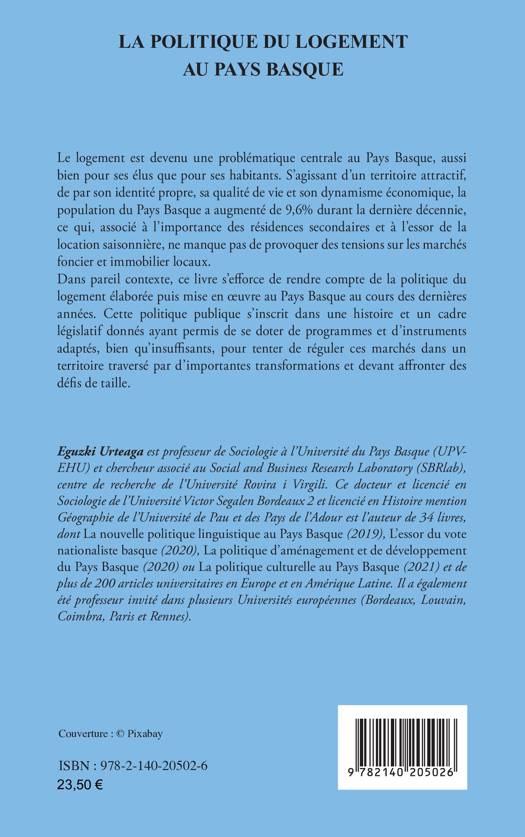 Le logement est devenu une problématique centrale au Pays Basque, aussi bien pour ses élus que pour ses habitants. S’agissant d’un territoire attractif, de par son identité propre, sa qualité de vie et son dynamisme économique, la population du Pays Basque a augmenté de 9,6% durant la dernière décennie, ce qui, associé à l’importance des résidences secondaires et à l’essor de la location saisonnière, ne manque pas de provoquer des tensions sur les marchés foncier et immobilier locaux. Dans pareil contexte, ce livre s’efforce de rendre compte de la politique du logement élaborée puis mise en œuvre au Pays Basque au cours des dernières années. Cette politique publique s’inscrit dans une histoire et un cadre législatif donnés ayant permis de se doter de programmes et d’instruments adaptés, bien qu’insuffisants, pour tenter de réguler ces marchés dans un territoire traversé par d’importantes transformations et devant affronter des défis de taille.