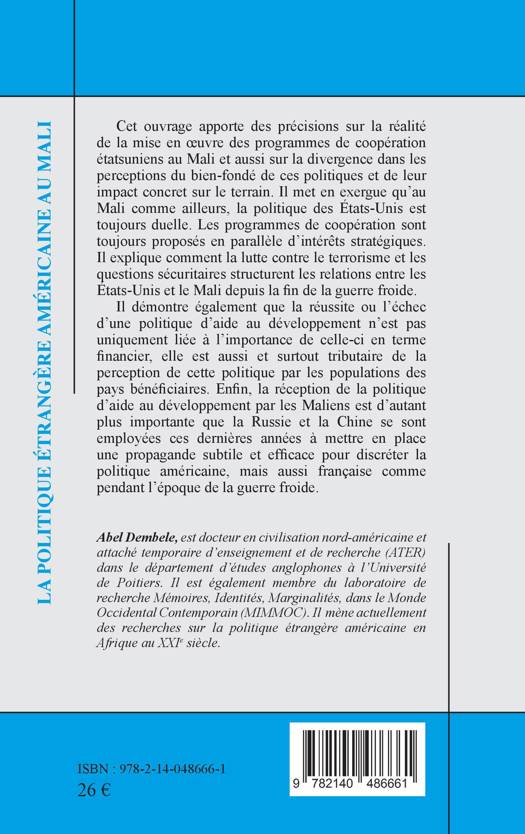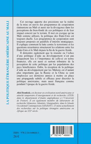 Cet ouvrage apporte des précisions sur la réalité de la mise en oeuvre des programmes de coopération étatsuniens au Mali et aussi sur la divergence dans les perceptions du bien-fondé de ces politiques et de leur impact concret sur le terrain. Il met en exergue qu'au Mali comme ailleurs, la politique des États-Unis est toujours duelle. Les programmes de coopération sont toujours proposés en parallèle d'intérêts stratégiques. Il explique comment la lutte contre le terrorisme et les questions sécuritaires structurent les relations entre les États-Unis et le Mali depuis la fin de la guerre froide. Il démontre également que la réussite ou l'échec d'une politique d'aide au développement n'est pas uniquement liée à l'importance de celle-ci en terme financier, elle est aussi et surtout tributaire de la perception de cette politique par les populations des pays bénéficiaires. Enfin, la réception de la politique d'aide au développement par les Maliens est d'autant plus importante que la Russie et la Chine se sont employées ces dernières années à mettre en place une propagande subtile et efficace pour discréter la politique américaine, mais aussi française comme pendant l'époque de la guerre froide.