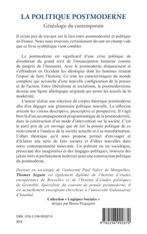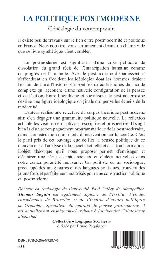 L'auteur réalise une relecture du corpus théorique postmoderne afin d'en dégager une grammaire politique nouvelle. C'est le parti pris de cet ouvrage que de lier la pensée politique de la postmodernité à l'analyse de la société actuelle et à sa transformation. L'objet théorique qu'il nous propose permet d'envisager et d'éclairer une série de faits sociaux et d'idées nouvelles dans notre contemporanéité mouvante.