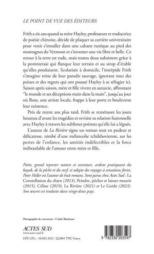 Frith a six ans quand sa mère Hayley, professeure et traductrice de poésie chinoise, décide de plaquer sa carrière universitaire pour venir s'installer dans une cabane rustique au pied des montagnes du Vermont et s'inventer une vie libre et belle. Ce retour à la terre est rude, mais toutes deux subsistent grâce à la pommeraie qui flanque leur terrain et au sirop d'érable qu'elles produisent. Scolarisée à domicile, l'intrépide Frith s'imagine reine de leur paradis sauvage, ignorant tout des peines et des regrets qui ont poussé Hayley à se réfugier ici. Saison après saison, mère et fille vivent en autarcie, affrontant "le monde et ses déceptions main dans la main", jusqu'au jour où Rose, une artiste locale, frappe à leur porte et bouleverse leur existence. Près de trente ans plus tard, Frith se remémore les jours heureux d'avant les tragédies et revisite sa relation fusionnelle avec Hayley à travers les sublimes poèmes qu'elle lui a légués. L'auteur de "La Rivière" signe un roman tout en pudeur et délicatesse, nimbé d'une mélancolie tchékhovienne, sur les pertes de l'enfance, les amitiés indéfectibles et la force inébranlable de l'amour entre mère et fille.
