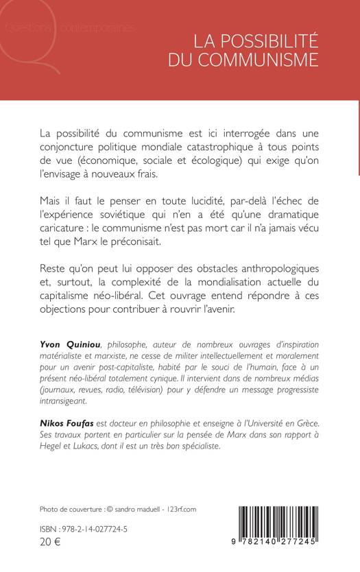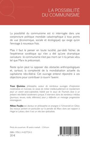 La possibilité du communisme est ici interrogée dans une conjoncture politique mondiale catastrophique à tous points de vue (économique, sociale et écologique) qui exige qu'on l'envisage à nouveaux frais. Mais il faut le penser en toute lucidité, par-delà l'échec de l'expérience soviétique qui n'en a été qu'une dramatique caricature : le communisme n'est pas mort car il n'a jamais vécu tel que Marx le préconisait. Reste qu'on peut lui opposer des obstacles anthropologiques et, surtout, la complexité de la mondialisation actuelle du capitalisme néo-libéral. Cet ouvrage entend répondre à ces objections pour contribuer à rouvrir l'avenir.
