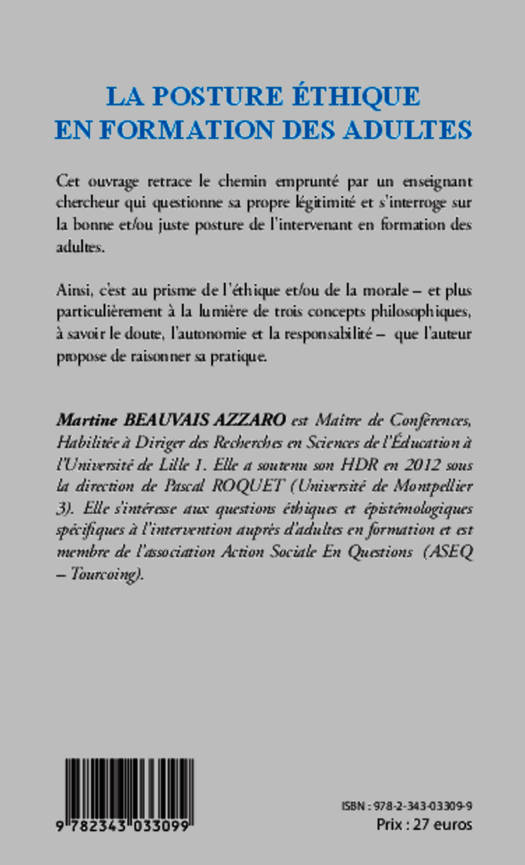 Cet ouvrage retrace le chemin emprunté par un enseignant chercheur qui questionne sa propre légitimité et s’interroge sur la bonne et/ou juste posture de l’intervenant en formation des adultes. Ainsi, c’est au prisme de l’éthique et/ou de la morale – et plus particulièrement à la lumière de trois concepts philosophiques, à savoir le doute, l’autonomie et la responsabilité – que l’auteur propose de raisonner sa pratique.
