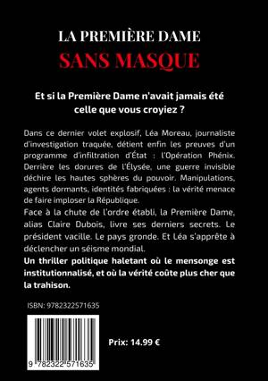 La Première Dame Sans Masque - Tome 3 Clôture magistrale d'un thriller politique d'exception La vérité éclate. Le pays tremble. Et cette fois, plus personne ne pourra l'arrêter. Dans ce dernier tome haletant, Léa Moreau, journaliste en cavale, détient les dernières pièces d'un puzzle d'État. Des preuves accablantes, des témoignages irréfutables, des aveux capables de faire basculer toute la République. Pendant ce temps, au sommet du pouvoir, le Président Julien Marceau affronte l'effondrement de son propre gouvernement. Entre trahisons internes, menaces d'assassinat, et guerre d'influence, l'Élysée devient un champ de ruines. Quant à Élisabeth Marceau, autrefois Première Dame de France, elle fait face à son destin dans un huis clos bouleversant mêlant rédemption et vérité ultime. Pourquoi ce livre est inoubliable: Un final tendu et cinématographique à la hauteur de la série. Des personnages déchirés entre devoir, mémoire et trahison. Une intrigue mondiale qui dépasse les frontières françaises. Une dénonciation puissante des manipulations d'État et du pouvoir profond. Le masque est tombé. Le système vacille. Et la vérité n'a jamais été aussi dangereuse.