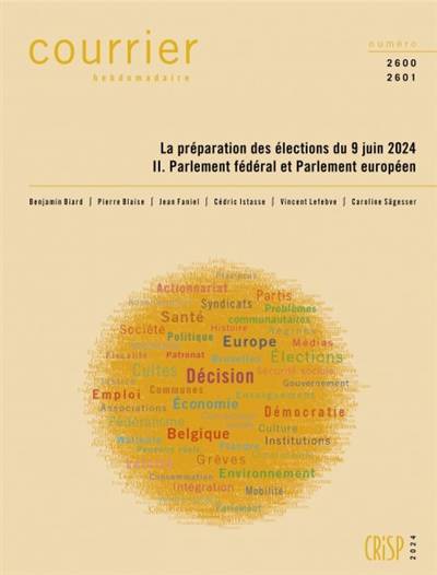 Le 9 juin 2024, les citoyens sont appelés à procéder à l’élection directe des 150 membres de la Chambre des représentants, des 22 représentants belges au Parlement européen, des 75 députés du Parlement wallon, des 89 députés du Parlement de la Région de Bruxelles-Capitale, des 124 députés du Parlement flamand et des 25 députés du Parlement de la Communauté germanophone. Indirectement, ils désigneront également 50 des 60 membres du Sénat (les 10 autres étant ensuite cooptés), les 94 députés du Parlement de la Communauté française et les membres des assemblées des trois Commissions communautaires bruxelloises. Ce Courrier hebdomadaire est consacré à la préparation de ce scrutin multiple.Ce deuxième volume est consacré au renouvellement des deux chambres du Parlement fédéral et à l’élection de la représentation belge au Parlement européen. Pour la Chambre des représentants, il rappelle le résultat des élections fédérales du 26 mai 2019 et la composition de l’assemblée sortante, puis il analyse les listes de candidats déposées dans chacune des onze circonscriptions électorales. Il procède de même pour la représentation belge au Parlement européen (la présentation des listes étant réalisée dans ce cas sur la base des trois collèges électoraux). Pour le Sénat, il indique les principales dispositions qui régissent la désignation des sénateurs et rappelle la composition de l’assemblée sortante. Les commentaires des candidatures attirent l’attention sur les stratégies des partis politiques dans la confection de leurs listes ;: présence de personnalités en ordre utile ou non, présence de mandataires ou d’élus locaux en vue de bénéficier de l’ancrage local du parti, etc.