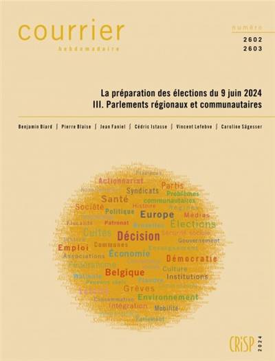 Le 9 juin 2024, les citoyens sont appelés à procéder à l’élection directe des 150 membres de la Chambre des représentants, des 22 représentants belges au Parlement européen, des 75 députés du Parlement wallon, des 89 députés du Parlement de la Région de Bruxelles-Capitale, des 124 députés du Parlement flamand et des 25 députés du Parlement de la Communauté germanophone. Indirectement, ils désigneront également 50 des 60 membres du Sénat (les 10 autres étant ensuite cooptés), les 94 députés du Parlement de la Communauté française et les membres des assemblées des trois Commissions communautaires bruxelloises. Ce Courrier hebdomadaire est consacré à la préparation de ce scrutin multiple. Ce troisième volume est consacré au renouvellement des différents parlements de Région et de Communauté. Assemblée par assemblée, il rappelle les résultats des élections régionales et communautaires du 26 mai 2019, et présente la hiérarchie des partis politiques qui avait découlé de ce scrutin. Il rappelle également la composition de l’assemblée élue il y a cinq ans, avant de signaler les éventuels mouvements de sièges survenus au cours de la législature 2019-2024. Ensuite, il analyse les listes de candidats déposées dans chacune des circonscriptions électorales. Les commentaires des candidatures attirent l’attention sur les stratégies des partis dans la confection de leurs listes : présence de personnalités en ordre utile ou non, présence de mandataires ou d’élus locaux en vue de bénéficier de l’ancrage local du parti, etc. Ce volume passe ainsi en revue tour à tour le Parlement wallon, le Parlement de la Région de Bruxelles-Capitale, le Parlement flamand et le Parlement de la Communauté germanophone. La composition du Parlement de la Communauté française est également rappelée.