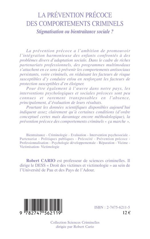 La prévention précoce a l'ambition de promouvoir l'intégration harmonieuse des enfants confrontés à des problèmes divers d'adaptation sociale, comme des comportements anti-sociaux persistants, voir criminels, en réduisant les facteurs de risque susceptibles d'y conduire. Les données scientifiques disponibles aujourd'hui indiquent assez clairement qu'à certaines conditions, la prévention précoce des comportements criminels " ça marche".