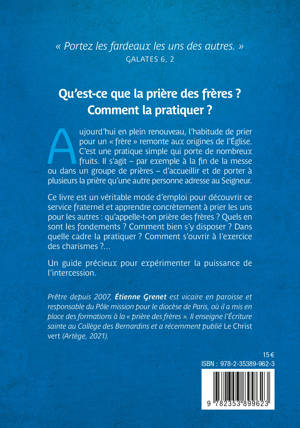 Aujourd’hui en plein renouveau, l’habitude de prier pour un « frère » remonte aux origines de l’Église. C’est une pratique simple qui porte de nombreux fruits. Il s’agit – par exemple à la fin de la messe ou dans un groupe de prières – d’accueillir et de porter à plusieurs la prière qu’une autre personne adresse au Seigneur. Ce livre est un véritable mode d’emploi pour découvrir ce service fraternel et apprendre concrètement à prier les uns pour les autres : qu’appelle-t-on prière des frères ? Quels en sont les fondements ? Comment bien s’y disposer ? Dans quelle cadre la pratiquer ? Comment s’ouvrir à l’exercice des charismes ?… Un guide précieux pour expérimenter la puissance de l’intercession.