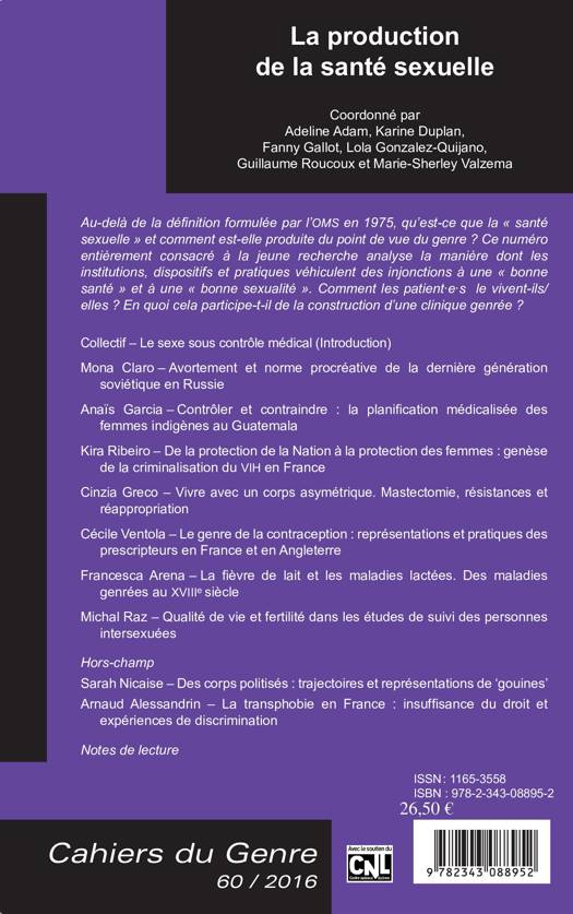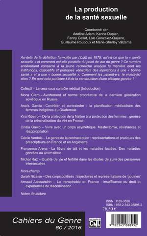 Au-delà de la définition formulée par l'OMS en 1975, qu'est-ce que la « santé sexuelle » et comment est-elle produite du point de vue du genre ? Ce numéro entièrement consacré à la jeune recherche analyse la manière dont les institutions, dispositifs et pratiques véhiculent des injonctions à une « bonne santé » et à une « bonne sexualité ». Comment les patientes le vivent-ils/ elles ? En quoi cela participe-t-il de la construction d'une clinique genrée ?