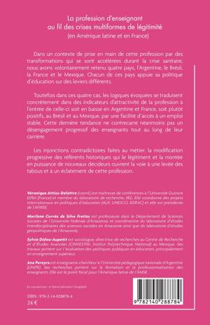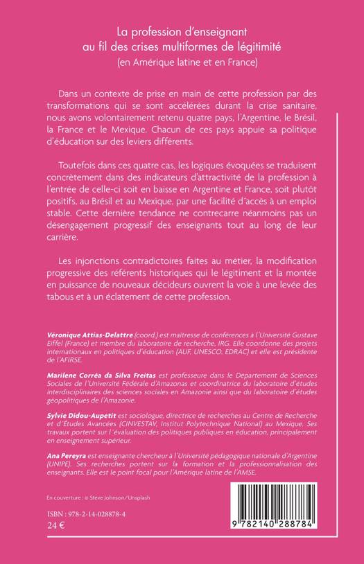 Dans un contexte de prise en main de cette profession par des transformations qui se sont accélérées durant la crise sanitaire, nous avons volontairement retenu quatre pays, l'Argentine, le Brésil, la France et le Mexique. Chacun de ces pays appuie sa politique d'éducation sur des leviers différents. Toutefois dans ces quatre cas, les logiques évoquées se traduisent concrètement dans des indicateurs d'attractivité de la profession à l'entrée de celle-ci soit en baisse en Argentine et France, soit plutôt positifs, au Brésil et au Mexique, par une facilité d´accès à un emploi stable. Cette dernière tendance ne contrecarre néanmoins pas un désengagement progressif des enseignants tout au long de leur carrière. Les injonctions contradictoires faites au métier, la modification progressive des référents historiques qui le légitiment et la montée en puissance de nouveaux décideurs ouvrent la voie à une levée des tabous et à un éclatement de cette profession.