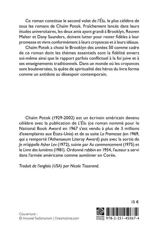 Ce roman constitue le second volet de l'Elu, le plus celebre de tous les romans de Chaim Potok. Fraichement lances dans leurs etudes universitaires, les deux amis ayant grandi a Brooklyn, Reuven Malter et Dany Saunders, doivent lutter pour rester fideles a leur promesse et vivre conformement a leurs croyances et a leurs ideaux. Chaim Potok a choisi le Brooklyn des annees 50 comme cadre de ce roman dont les themes essentiels sont la fidelite envers soi-meme ainsi que le rapport parfois conflictuel a la foi juive et a ses enseignements traditionnels. Dans un monde ou les croyances sont bouleversees, la quete de spiritualite des heros du livre forme comme un antidote au desespoir contemporain.