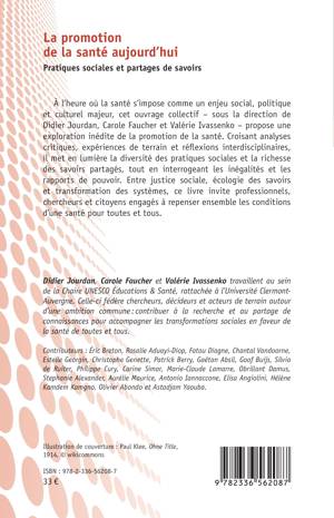 À l'heure où la santé s'impose comme un enjeu social, politique et culturel majeur, cet ouvrage collectif - sous la direction de Didier Jourdan, Carole Faucher et Valérie Ivassenko - propose une exploration inédite de la promotion de la santé. Croisant analyses critiques, expériences de terrain et réflexions interdisciplinaires, il met en lumière la diversité des pratiques sociales et la richesse des savoirs partagés, tout en interrogeant les inégalités et les rapports de pouvoir. Entre justice sociale, écologie des savoirs et transformation des systèmes, ce livre invite professionnels, chercheurs et citoyens engagés à repenser ensemble les conditions d'une santé pour toutes et tous.