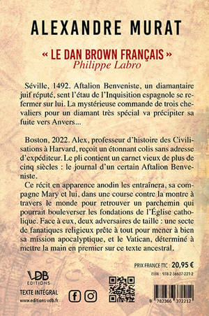 Boston, 2022. Alex, professeur d’histoire des Civilisations à Harvard, reçoit un étonnant colis sans adresse d’expéditeur. Le pli contient un carnet vieux de plus de cinq siècles : le journal d’un certain Aftalion Benveniste. Ce récit en apparence anodin les entraînera, sa compagne Mary et lui, dans une course contre la montre à travers le monde pour retrouver un parchemin qui pourrait bouleverser les fondations de l’Église catholique. Face à eux, deux adversaires de taille : une secte de fanatiques religieux prête à tout pour mener à bien sa mission apocalyptique, et le Vatican, déterminé à mettre la main en premier sur ce texte ancestral.