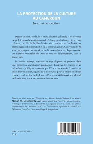 Depuis un demi-siècle, la mondialisation culturelle est devenue tangible à travers la multiplication des échanges sur les biens et les services culturels, du fait de la libéralisation du commerce et l'explosion des technologies de l'information et de la communication. Ces évolutions ne vont pas sans poser de questions sur la reconnaissance et la préservation des identités culturelles des pays en voie de développement, dont le Cameroun. Le présent ouvrage, structuré en sept chapitres, se propose, dans une perspective d'évaluation prospective, d'analyser les normes et les mécanismes juridiques actionnés par l'Etat camerounais, à travers les textes internationaux, régionaux et nationaux, pour la protection de ses ressources culturelles, multiples et variées, la consolidation de son identité multiethnique, et son rayonnement international.