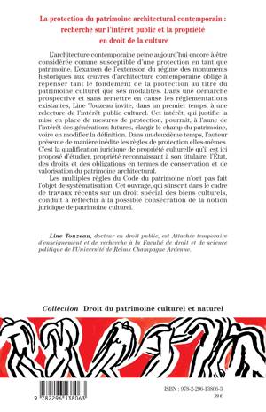L'architecture contemporaine peine à être considérée comme susceptible d'une protection en tant que patrimoine. Dans une démarche prospective, l'auteur invite à une relecture de l'intérêt public culturel, qui pourrait élargir le champ du patrimoine. Elle étudie la qualification juridique de propriété culturelle, qui reconnaît au titulaire, l'État, des droits et des obligations en termes de conservation et de valorisation du patrimoine architectural. Elle conduit à la possible consécration de la notion juridique de patrimoine culturel.