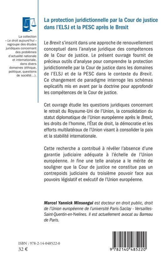 Le Brexit s'inscrit dans une approche de renouvellement conceptuel dans l'analyse juridique des compétences de la Cour de justice. Cet ouvrage fournit de précieux outils d'analyse pour comprendre la protection juridictionnelle par la Cour de justice dans les domaines de l ELSJ et de la PESC dans le contexte du Brexit. Ce changement de paradigme interroge les schémas explicatifs mis en avant par la doctrine pour approfondir les compétences de la Cour de justice. Ce livre étudie les questions juridiques concernant le retrait du Royaume-Uni de l'Union, la consolidation du statut diplomatique de l'Union européenne après le Brexit, les droits de l'homme, l'État de droit, la démocratie et les efforts multilatéraux de l'Union visant à consolider la paix et la stabilité internationale. Cette recherche a contribué à révéler l'absence d'une garantie judiciaire adéquate à l'échelle de l'Union européenne. In fine une telle analyse a le mérite de souligner que la Cour de justice ne constitue pas un contrepoids judiciaire du troisième pouvoir face aux pouvoirs législatif et exécutif de l'Union européenne.