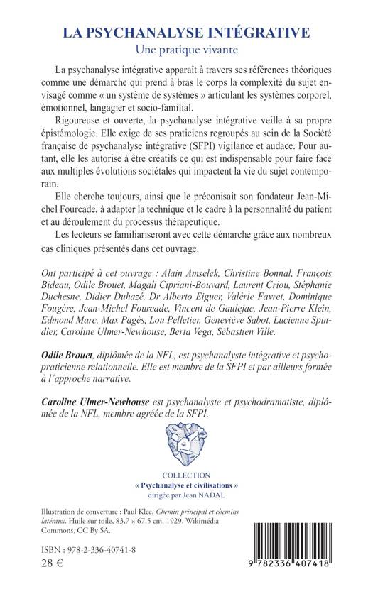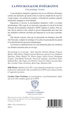 La psychanalyse intégrative apparaît à travers ses références théoriques comme une démarche qui prend à bras le corps la complexité du sujet envisagé comme un système de systèmes articulant les systèmes corporel, émotionnel, langagier et socio-familial. Rigoureuse et ouverte, la psychanalyse intégrative veille à sa propre épistémologie. Elle exige de ses praticiens regroupés au sein de la Société française de psychanalyse intégrative (SFPI) vigilance et audace. Pour autant, elle les autorise à être créatifs ce qui est indispensable pour faire face aux multiples évolutions sociétales qui impactent la vie du sujet contemporain. Elle cherche toujours, ainsi que le préconisait son fondateur Jean-Michel Fourcade, à adapter la technique et le cadre à la personnalité du patient et au déroulement du processus thérapeutique. Les lecteurs se familiariseront avec cette démarche grâce aux nombreux cas cliniques présentés dans cet ouvrage.