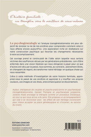 L'histoire familiale : un tremplin vers le meilleur de vous-mêmes. La psychogénéalogie et l'analyse transgénérationnelle ont pour objectif de revisiter la vie de nos ancêtres pour comprendre comment celle-ci nous affecte encore aujourd'hui. Une exploration riche en révélations sur notre construction psychique qui favorise les changements nécessaires à notre accomplissement. Cet ouvrage prend le contre-pied de l'idée selon laquelle nous serions victimes des souffrances vécues par les générations précédentes. Loin d'être enfermés dans une vision fataliste qui nous obligerait à payer pour ce que d'autres ont vécu par le passé, nous sommes, au contraire, pleinement libres, en changeant de regard, de transformer notre héritage en quelque chose qui nous ressemble. Grâce à cette méthode d'investigation de votre histoire familiale, appropriez-vous le passé de vos ancêtres et apprenez à y insuffler vos propres couleurs, vos images et vos rêves, entre émancipation et discernement.